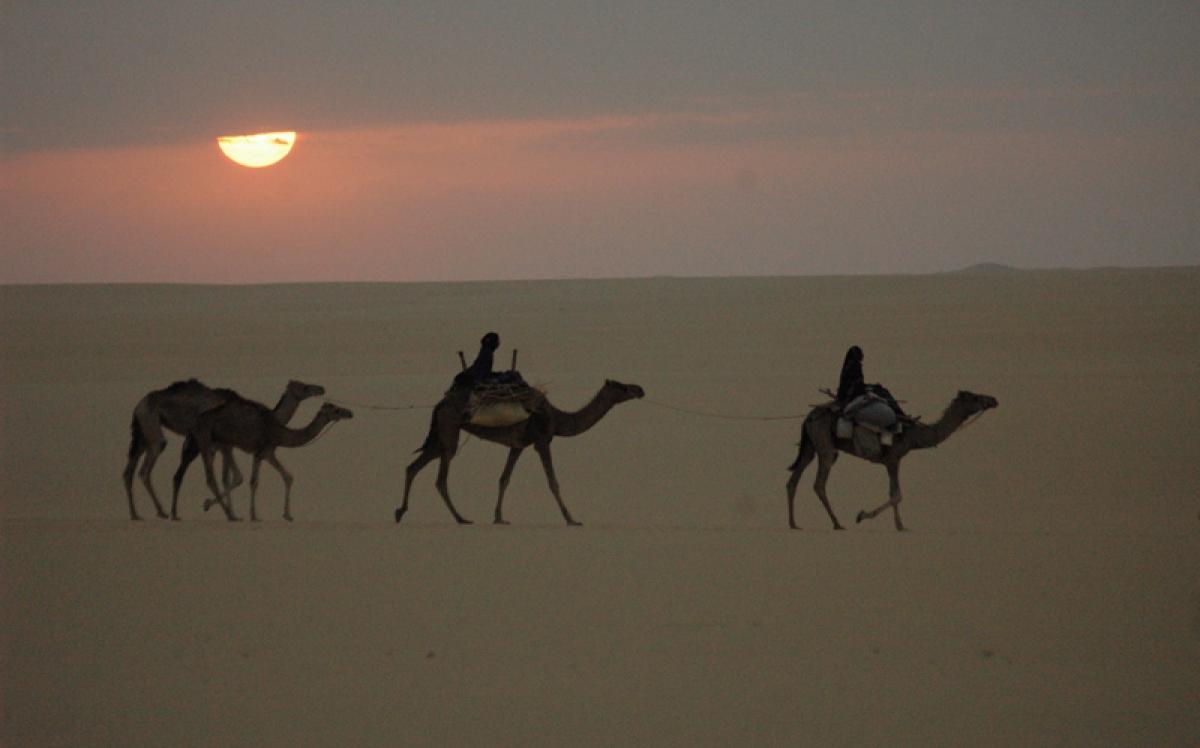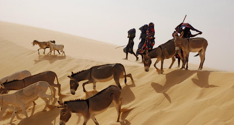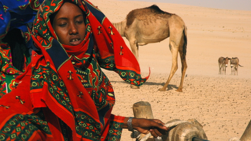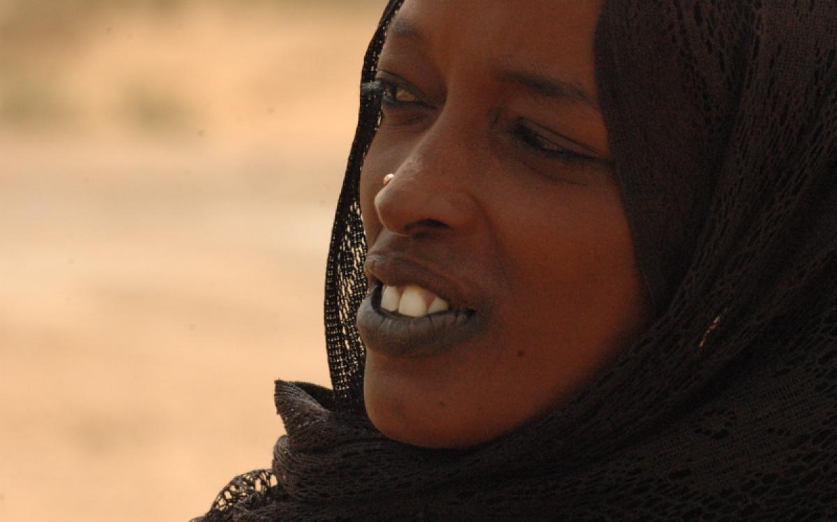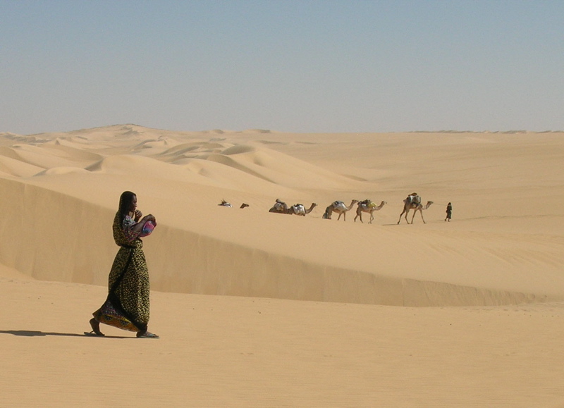 Amina s'apprête pour la caravane des dattes. Chaque année, avec d'autres femmes Toubou, elle fait ce voyage de 1500 km à travers le Sahara en dépit des dangers, de la chaleur (50°C) et des tempêtes de sable.